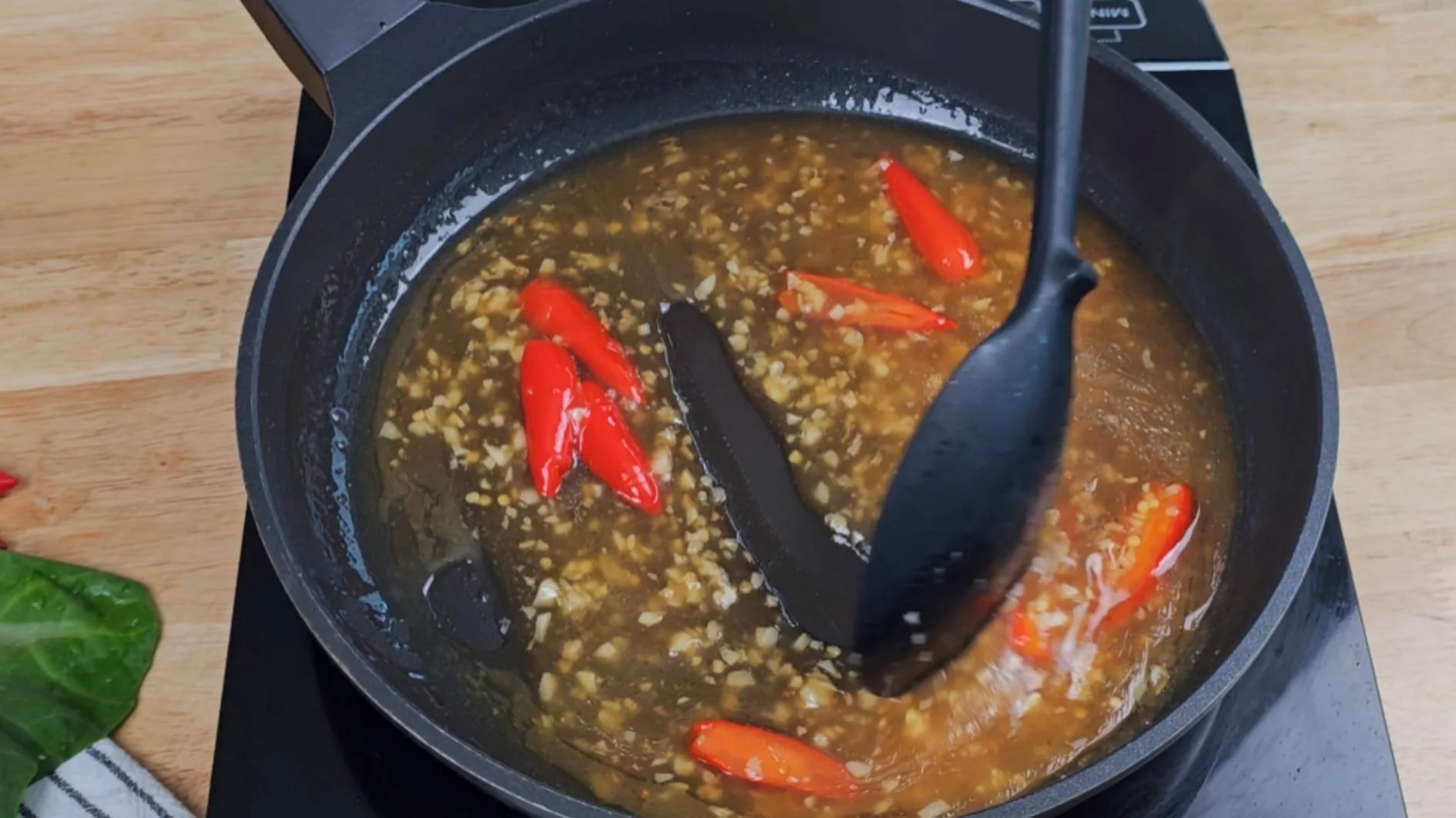 In a pan, heat two tablespoons of oil, gently sauté the minced garlic and chillies over low heat until fragrant