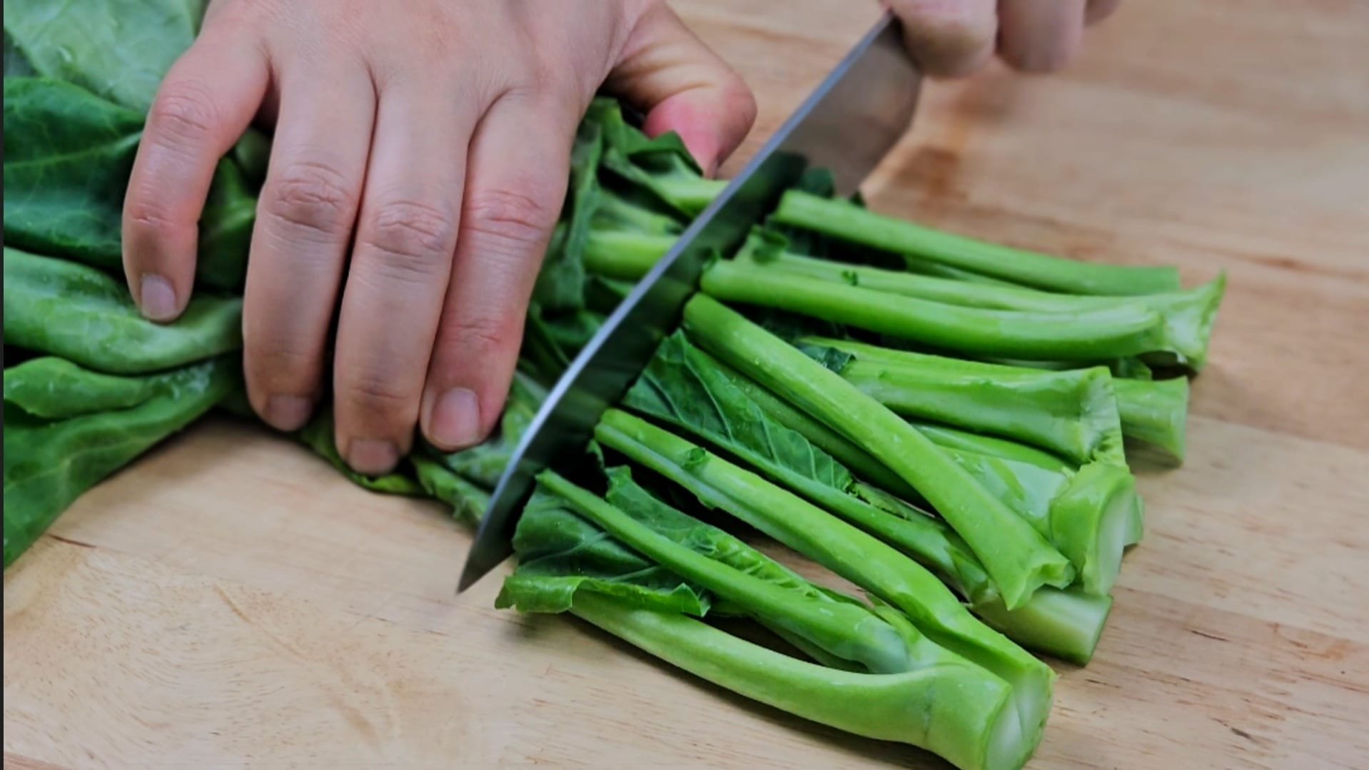 Start by washing the kailan thoroughly under running water, trimming off the tough ends, and splitting any thick stems in half.