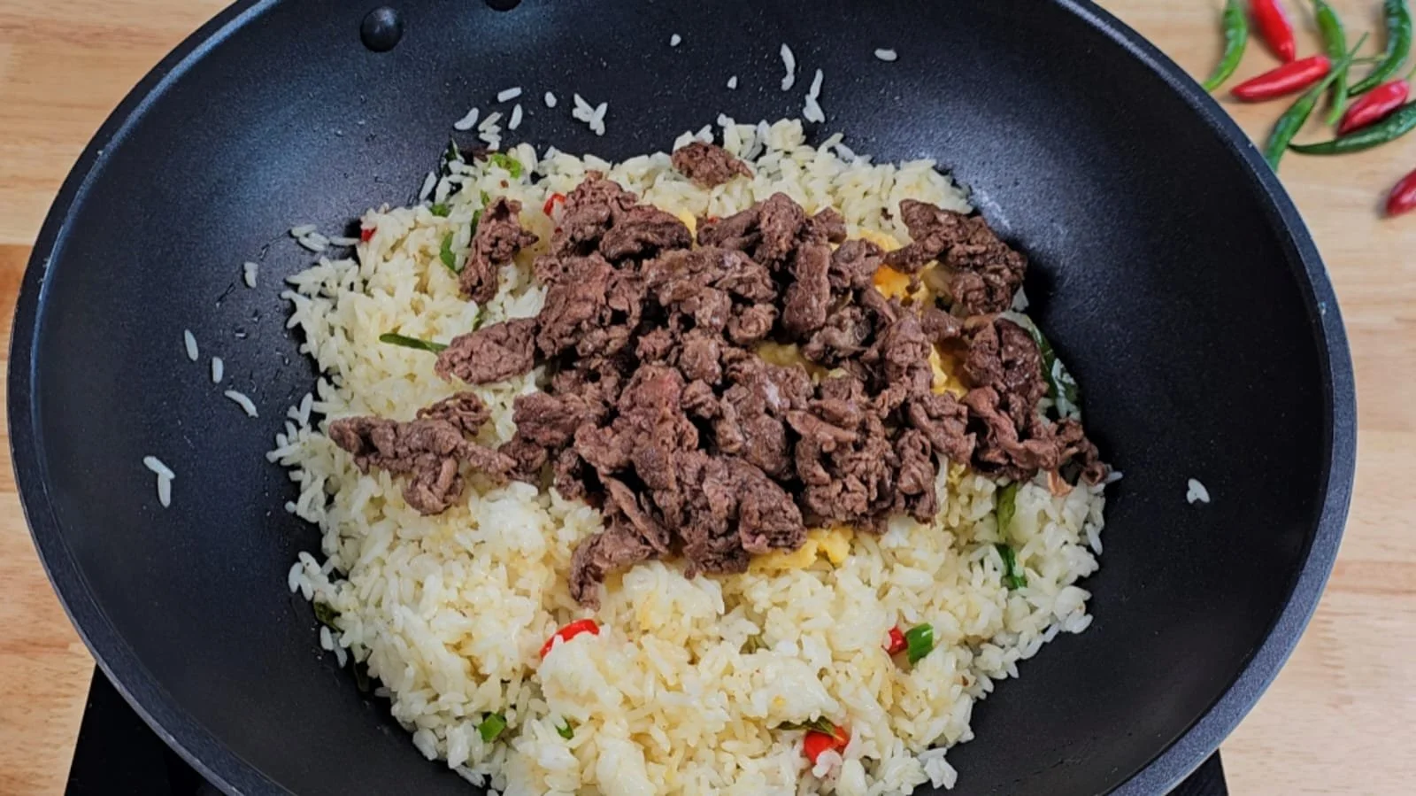 Next, add the rice and stir-fry over high heat for a few minutes. You’ll know it’s ready when you hear little popping sounds and see the rice grains start to jump in the pan. Then, return the cooked beef and scrambled eggs to the pan and mix everything together until well combined.