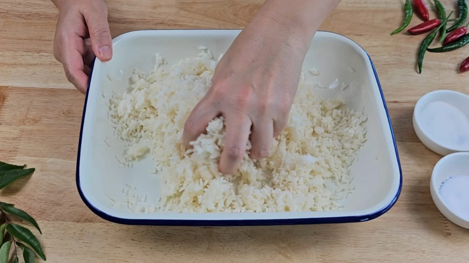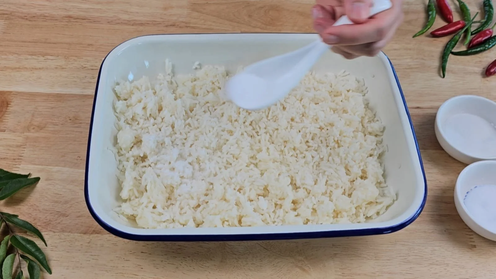I microwave the rice according to the packet instructions, then let it cool down a little before seasoning. A simple mix of salt and sugar is enough for me, but you can definitely add your favorite seasonings if you like. I keep it light because I want the aroma of butter and curry leaves to really shine later in the dish.