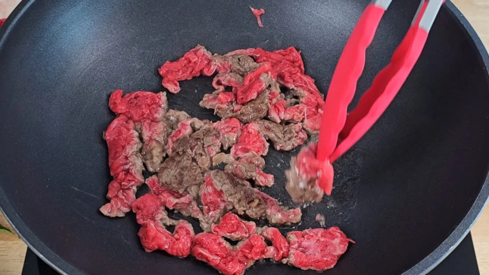 Cook the beef – Heat 1 tablespoon of cooking oil in a pan over medium-high heat. Add the beef slices and pan-sear for 2–3 minutes until they are just cooked through.