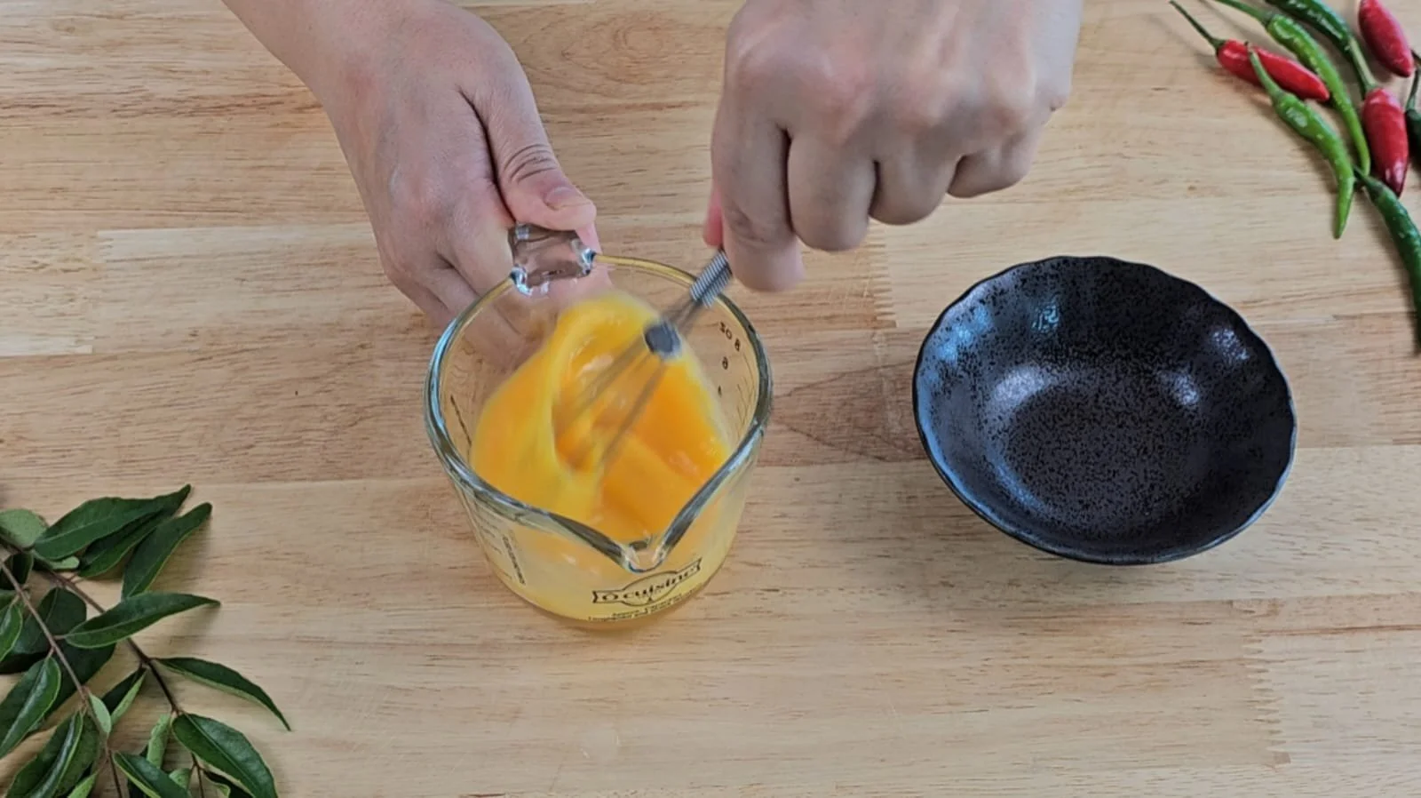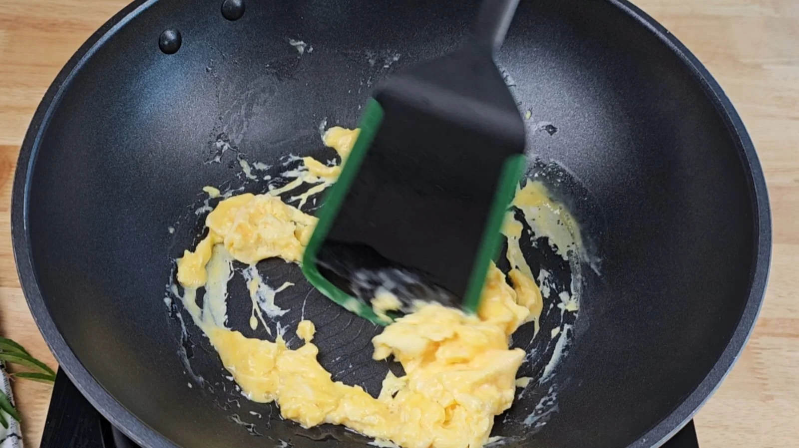 Crack 2 medium eggs into a bowl and beat them well. Heat 1 tablespoon of oil in a pan, then pour in the eggs. Scramble gently until just cooked through, then remove from the pan and set aside.