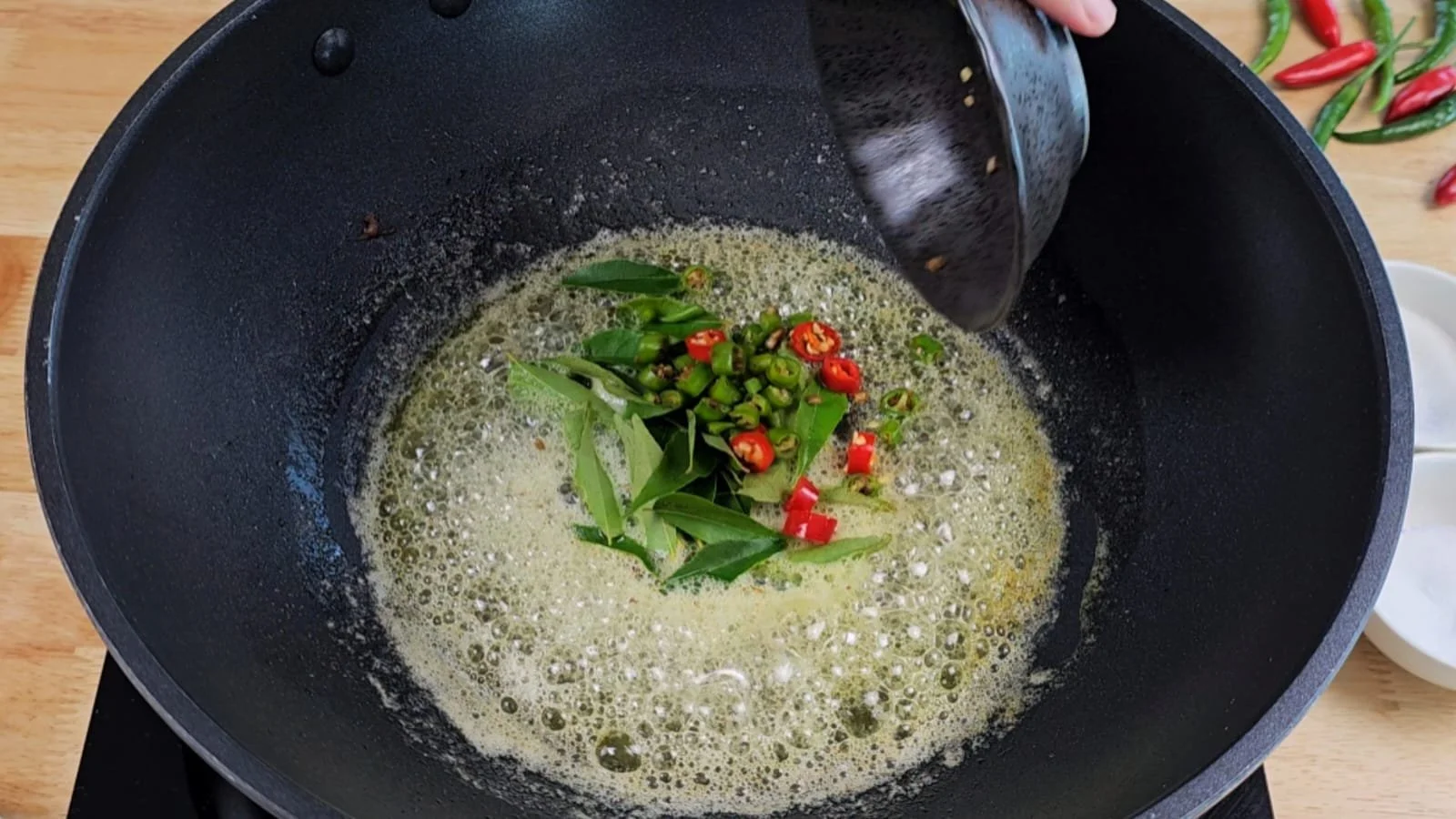 Now it’s time to bring everything together and make the fried rice. Using the same pan you cooked the beef and eggs in, add 50g of butter and let it melt slowly. Once melted, add about 8g of curry leaves along with some fresh chilies. For this recipe, green chilies are a must—they give off a unique aroma that pairs beautifully with the butter and curry leaves. You can also add a few red chilies if you’d like extra heat.
