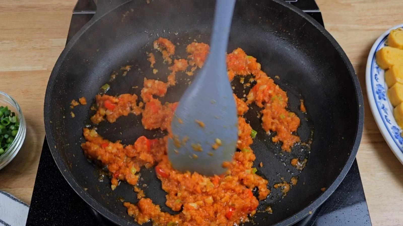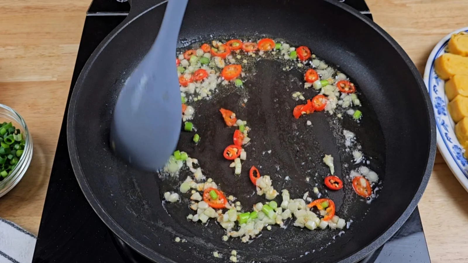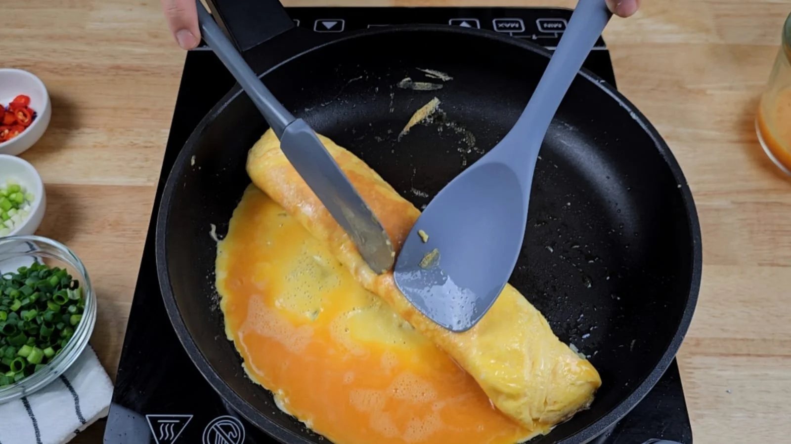 Once the omelette has absorbed all that sweet and spicy goodness, sprinkle over the green parts of the scallions and remove from the heat. Your dish is ready to serve—perfect with a bowl of steamed rice!