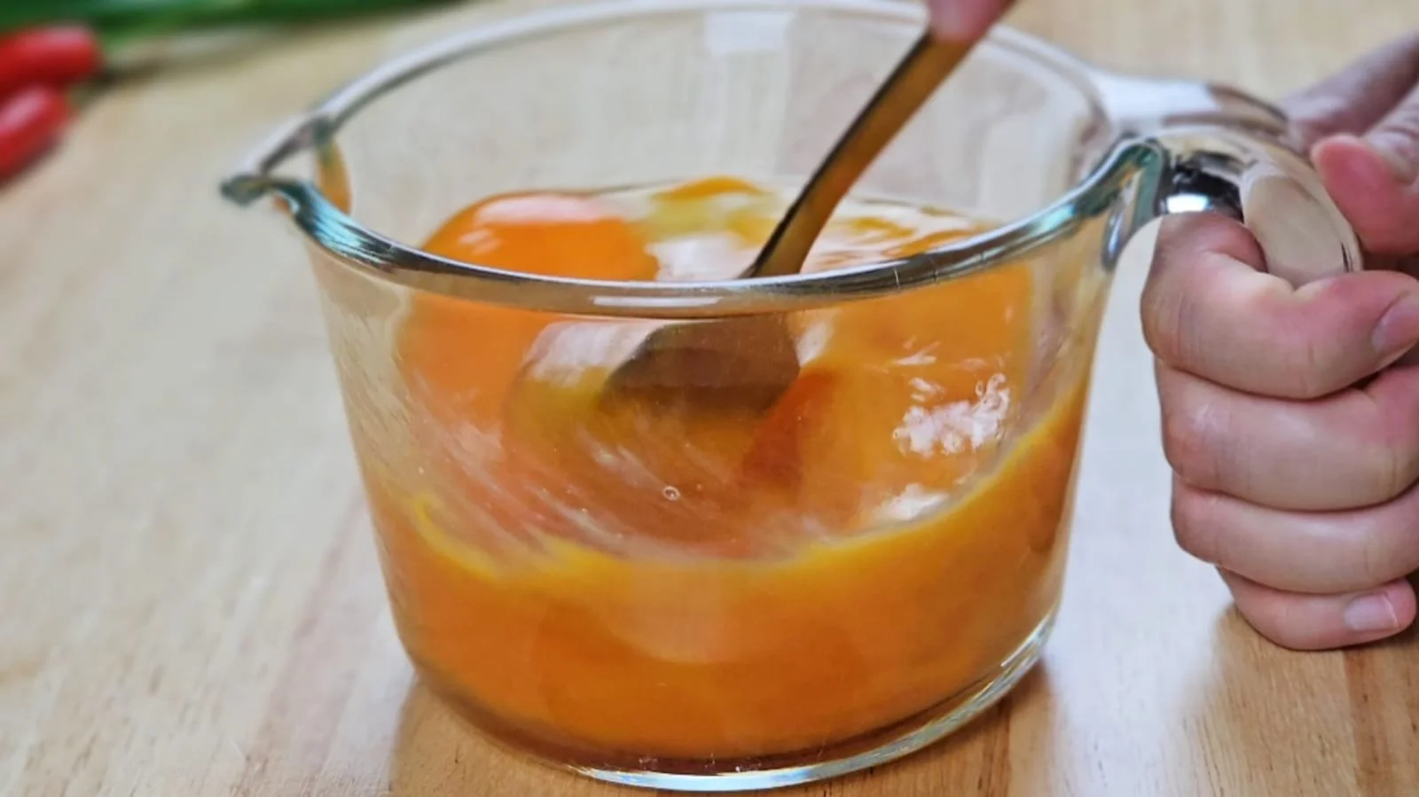 Crack 6 medium eggs into a bowl and season with ½ tablespoon soy sauce, ½ tablespoon sugar, and ½ teaspoon salt. Grate in ½ clove of garlic and ½ teaspoon of ginger. Beat well until everything is combined, then set aside.