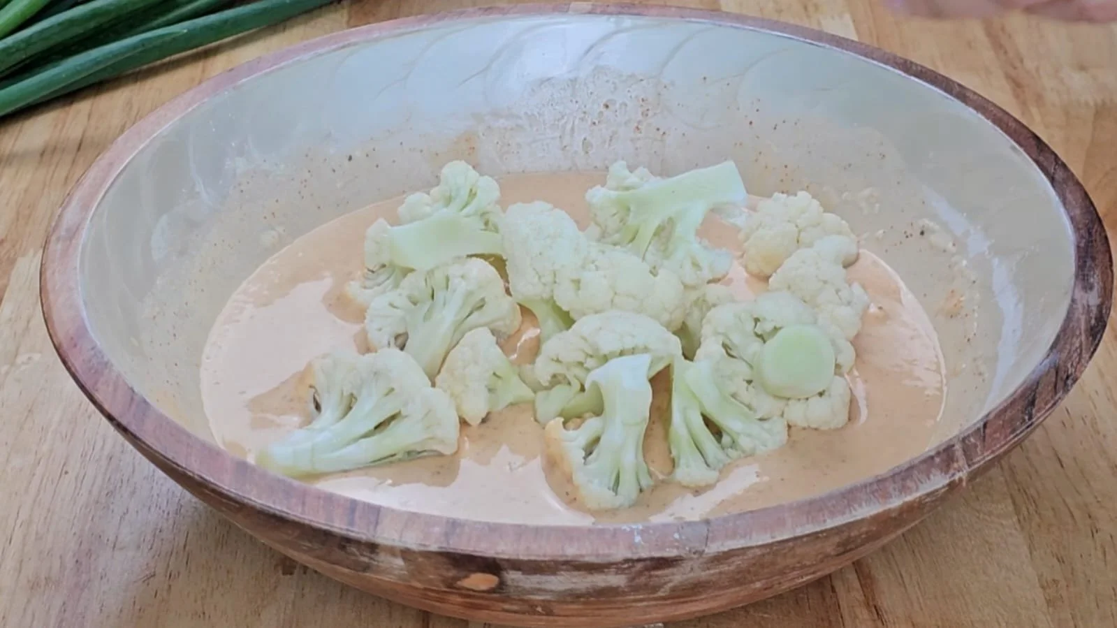 Add the cauliflower florets to the mixing bowl and toss well until each piece is evenly coated, making sure the batter covers all the nooks and crannies