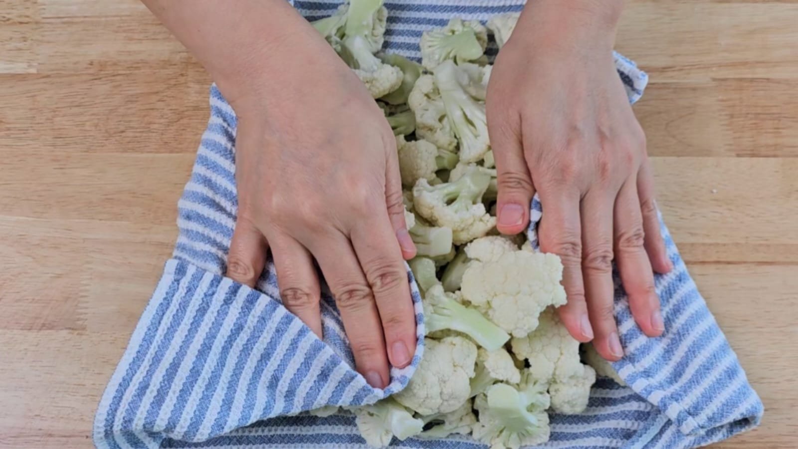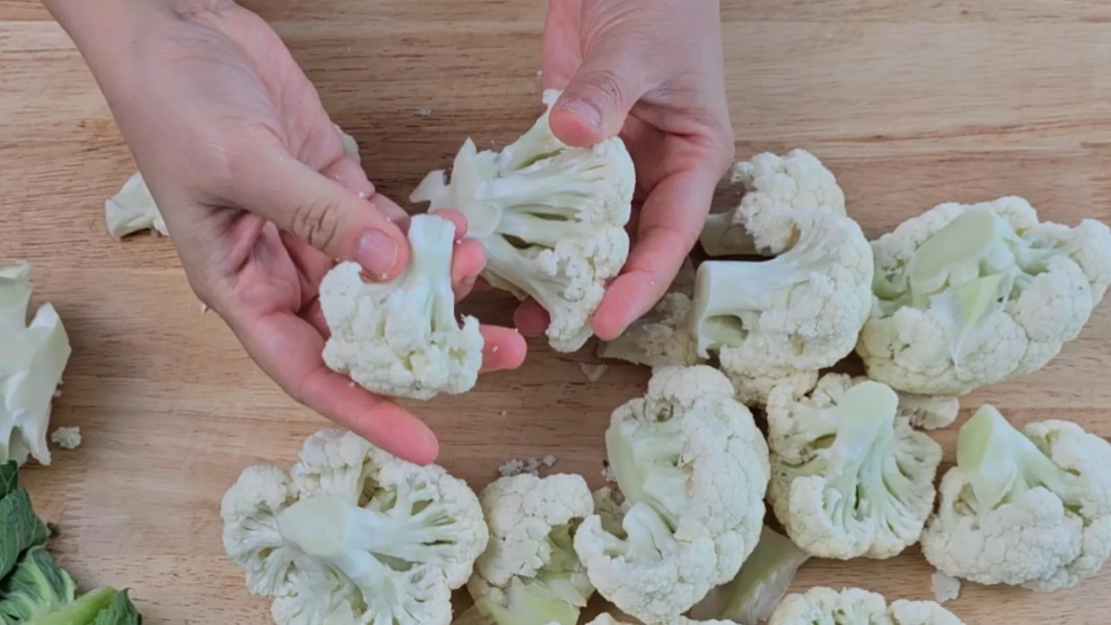 Cut the cauliflower into bite-sized florets, making sure they’re not too small—this helps prevent them from overcooking during deep frying. Rinse the florets thoroughly under cold water, then pat them dry with a clean tea towel or paper towels.
