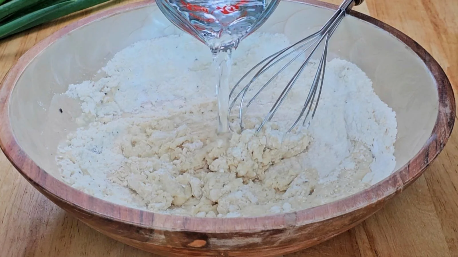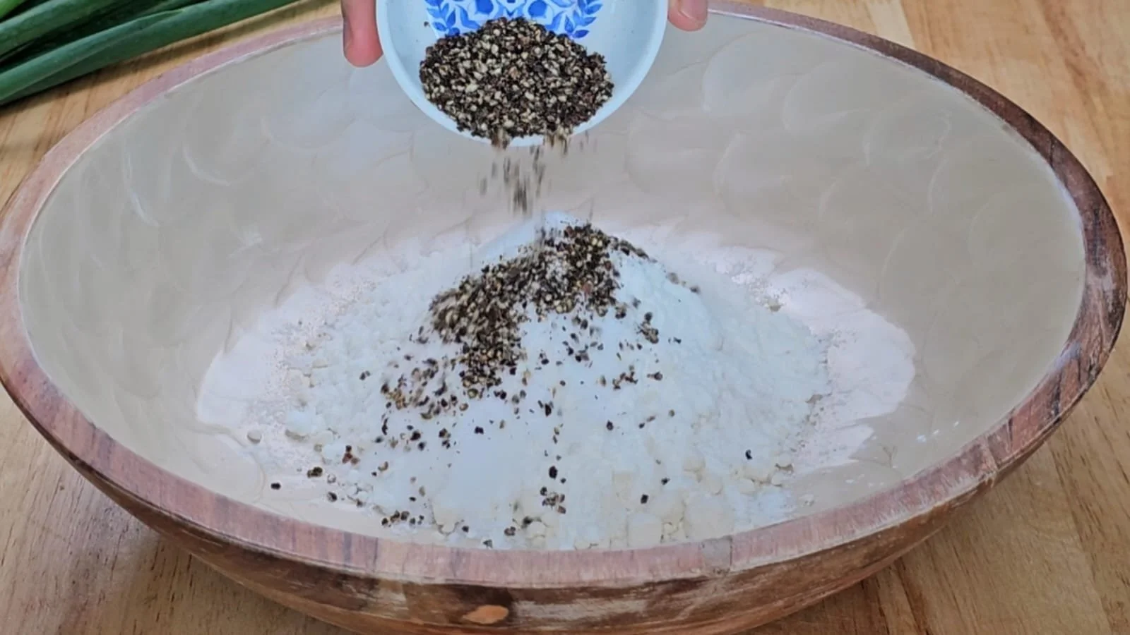 In a large mixing bowl, combine the dry ingredients: 1 cup plain flour, 1 tablespoon salt, ½ tablespoon pepper, 1 tablespoon paprika, and 1 teaspoon baking soda. Mix well to evenly distribute the spices. Slowly pour in 1½ cups of water while stirring continuously. Add just enough water to achieve a smooth, slightly thick batter consistency.