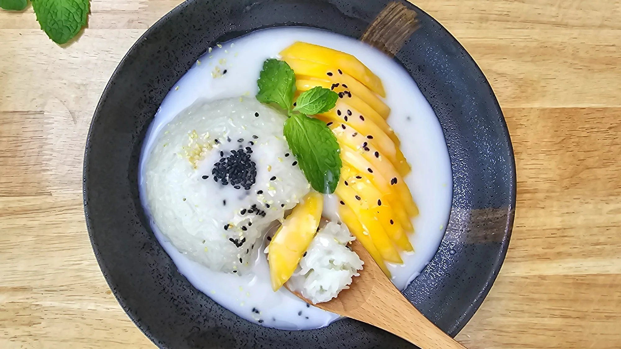 Assemble the dish by placing the sticky rice and sliced mango on a serving plate. Drizzle the thickened coconut sauce generously over the top. I garnished mine with a sprinkle of sesame seeds for a little extra crunch.