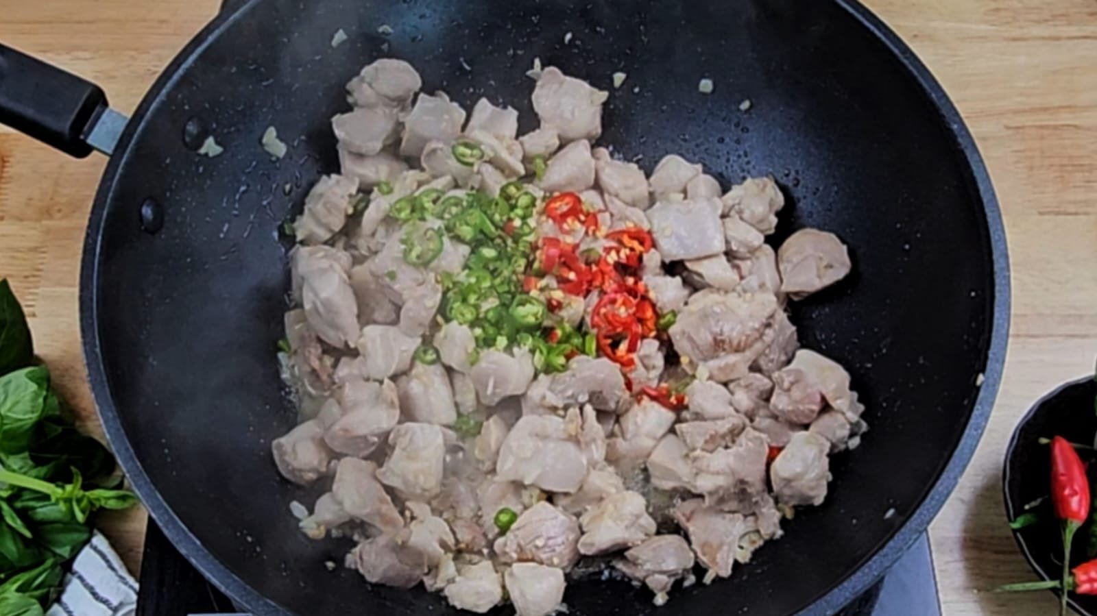 Next, add the chicken pieces and stir-fry for a few minutes until the pink color is gone. Add the chillies and continue to stir-fry for another minute or two.