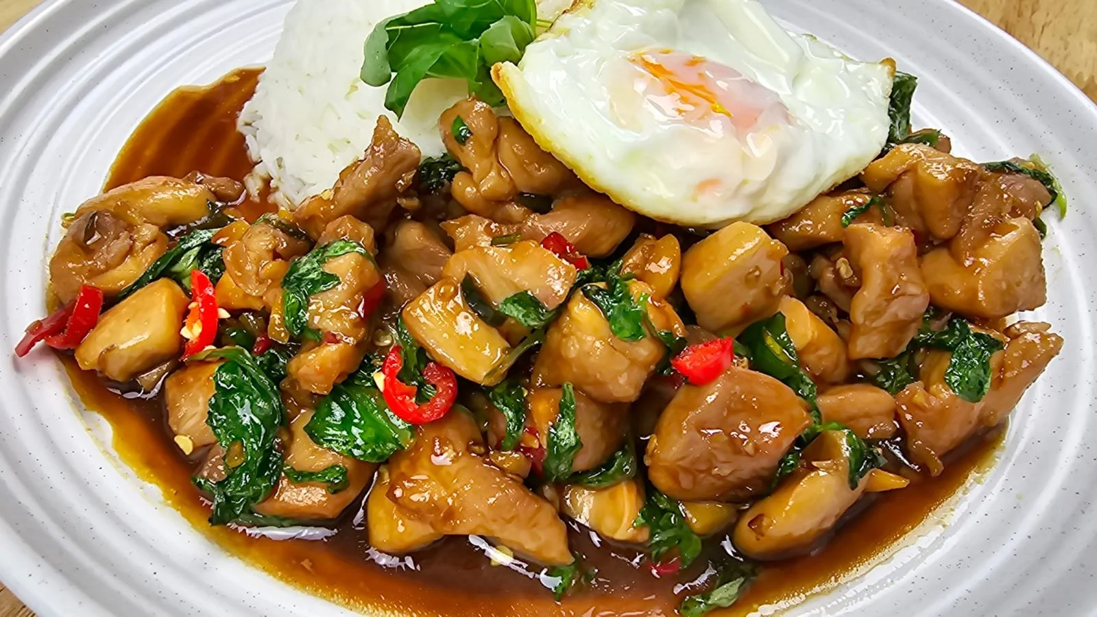Thai Chilli Basil Chicken, also known as Pad Krapow Gai (ผัดกะเพราไก่), is one of Thailand’s most popular and beloved street food dishes. The dish is known for its bold, aromatic flavors — spicy from the chillies, garlicky, salty, and slightly sweet — perfectly balanced the way Thai food always is. The basil adds a signature fragrance that makes the dish instantly recognizable. Traditionally, it’s served over steamed jasmine rice and topped with a crispy fried egg. The runny yolk mixes into the rice and sauce, making every bite rich and satisfying.