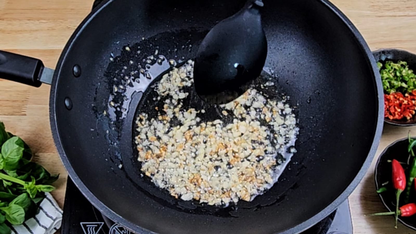 Heat 4 tablespoons of oil in a wok or large pan over medium-high heat. Add the minced garlic and sauté for a couple of minutes, or until golden and fragrant.