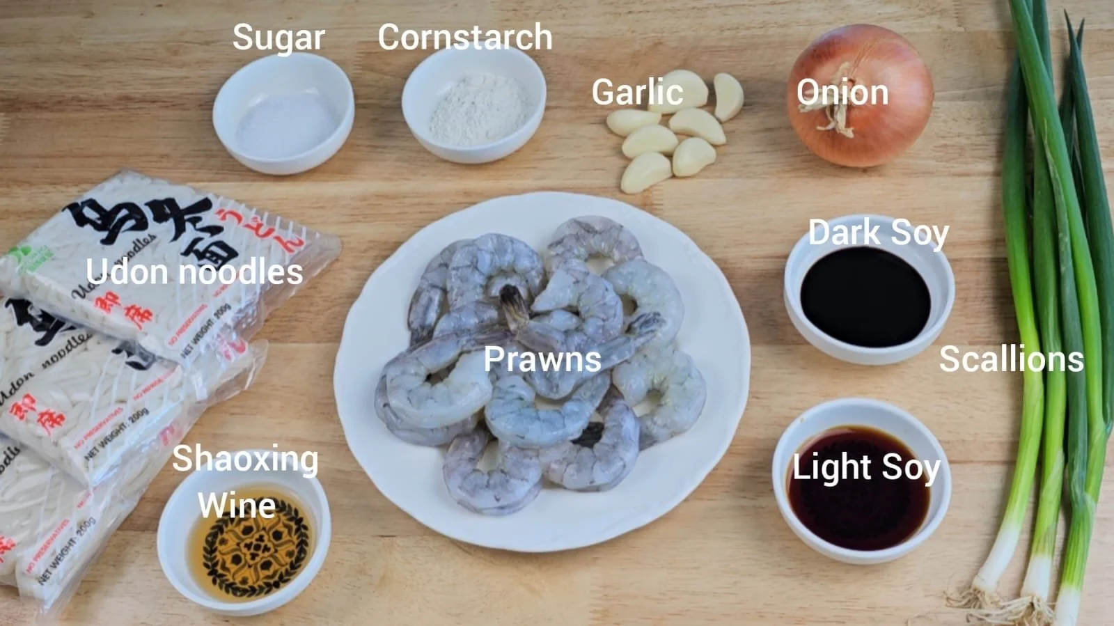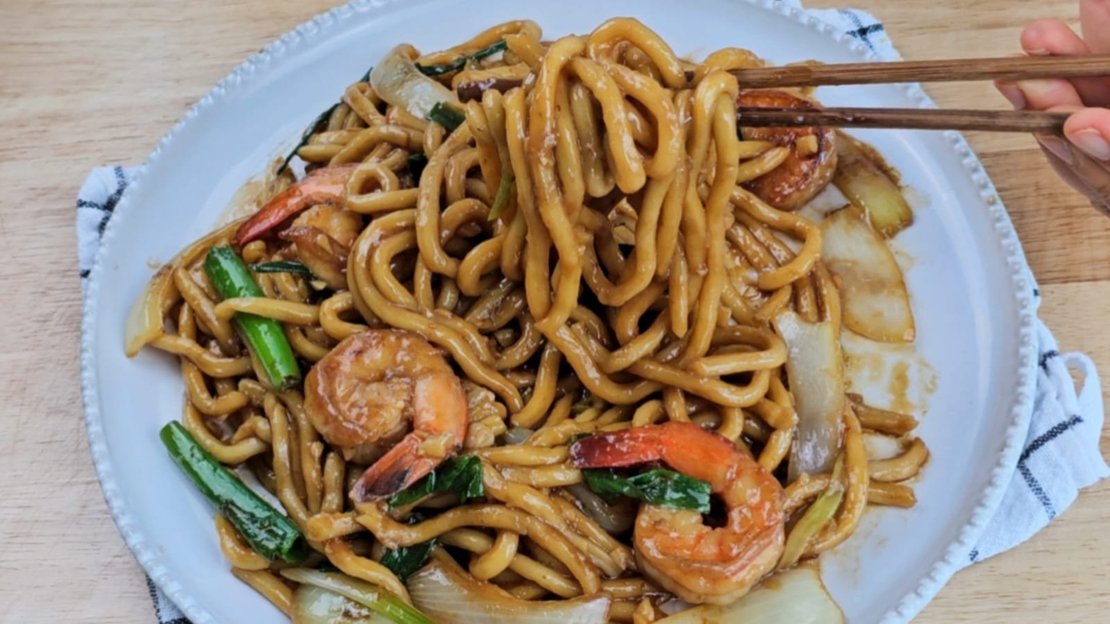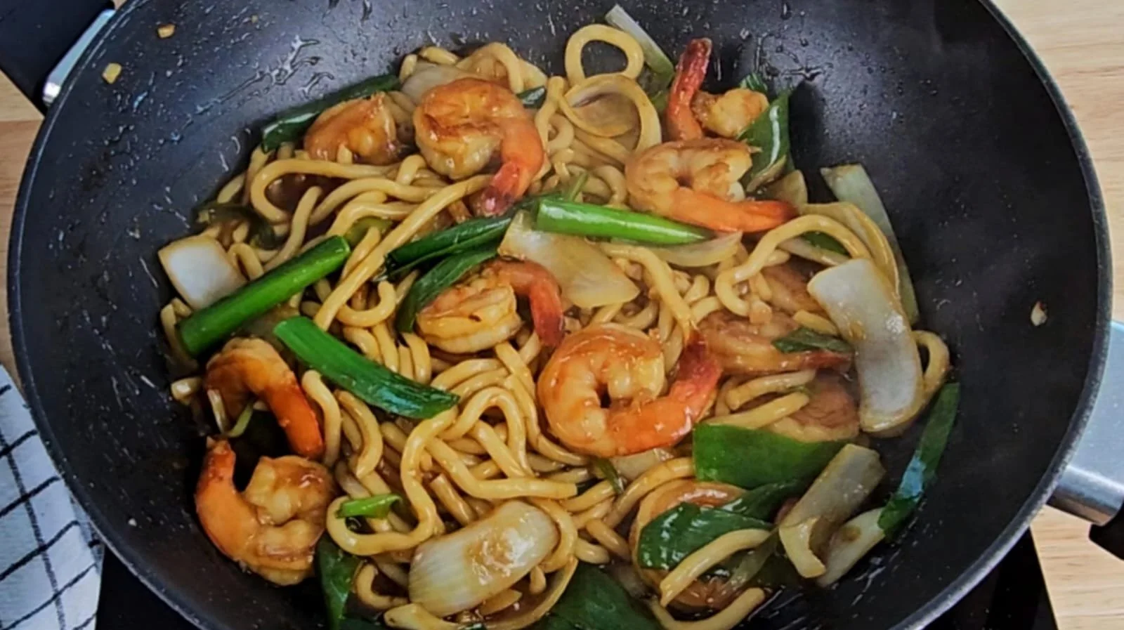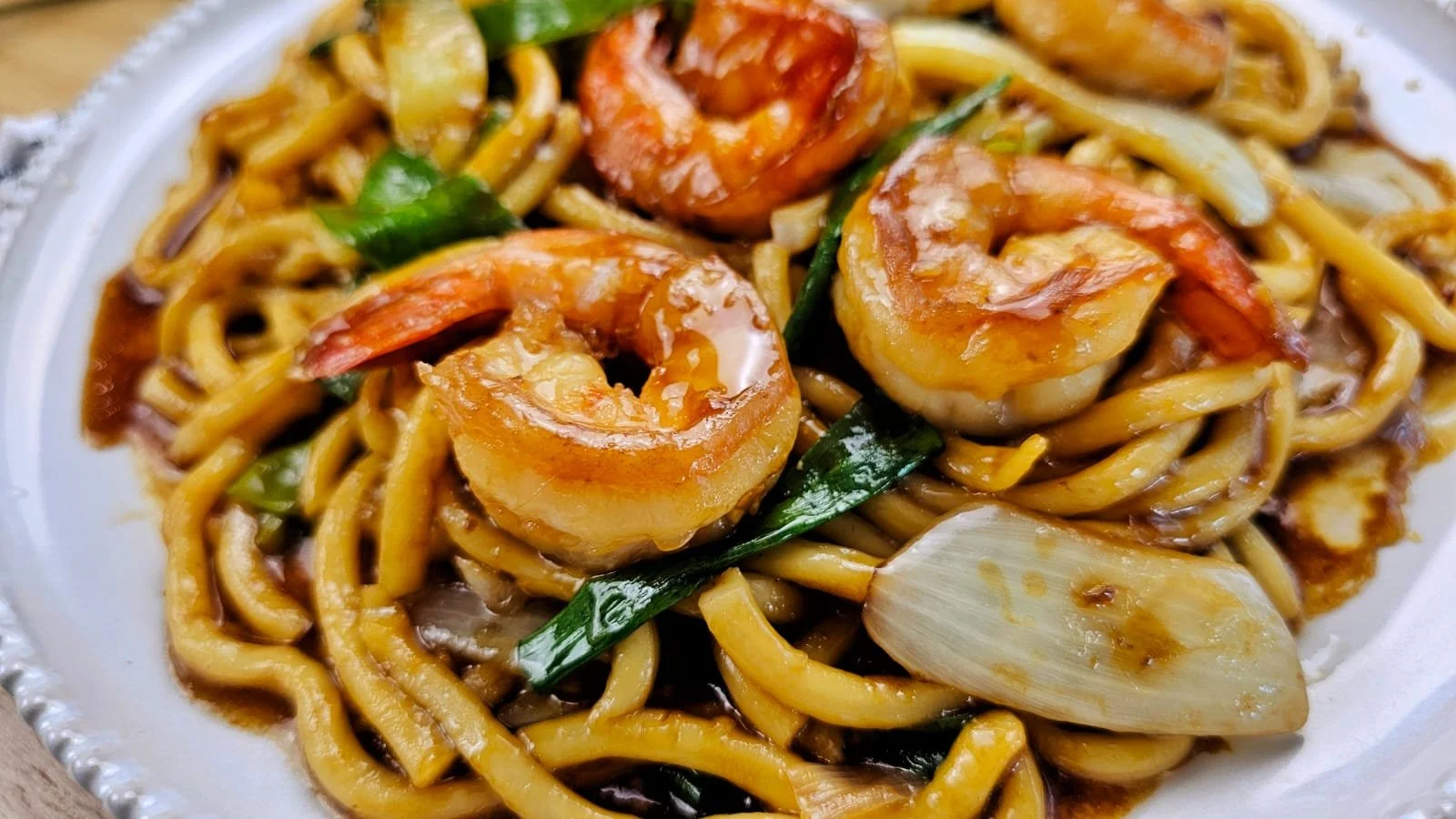 Juicy prawns, sweet onions, and fresh scallions are stir-fried with chewy udon noodles, then tossed in a simple 6-ingredient sauce made with light soy, dark soy, Shaoxing wine, sugar, water, and cornstarch. The result? A glossy, garlicky noodle dish that’s rich, savory, and so satisfying!