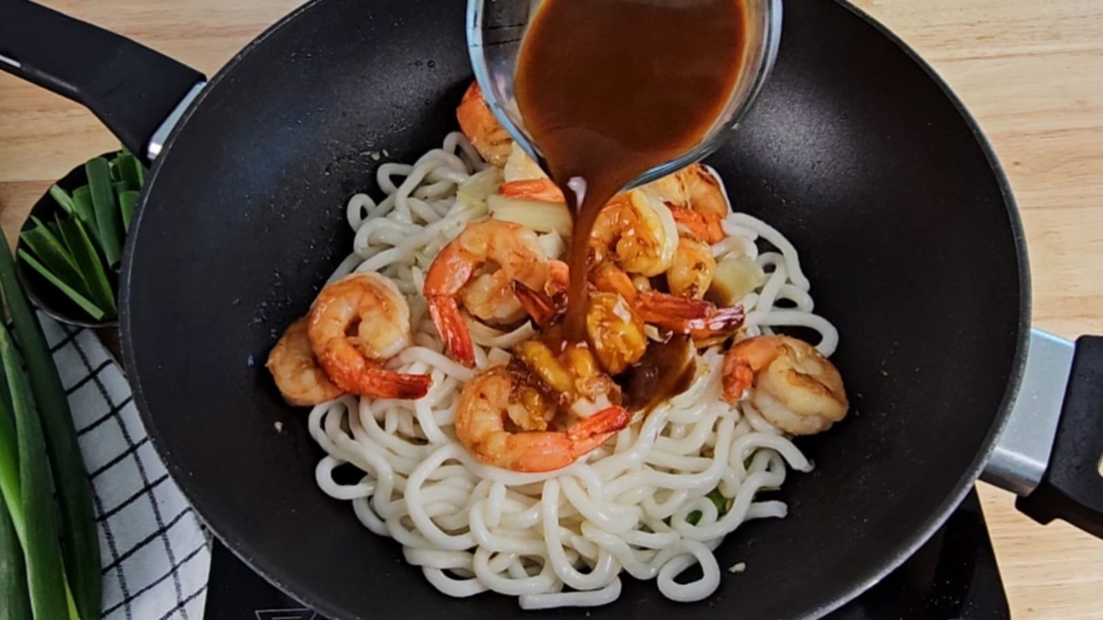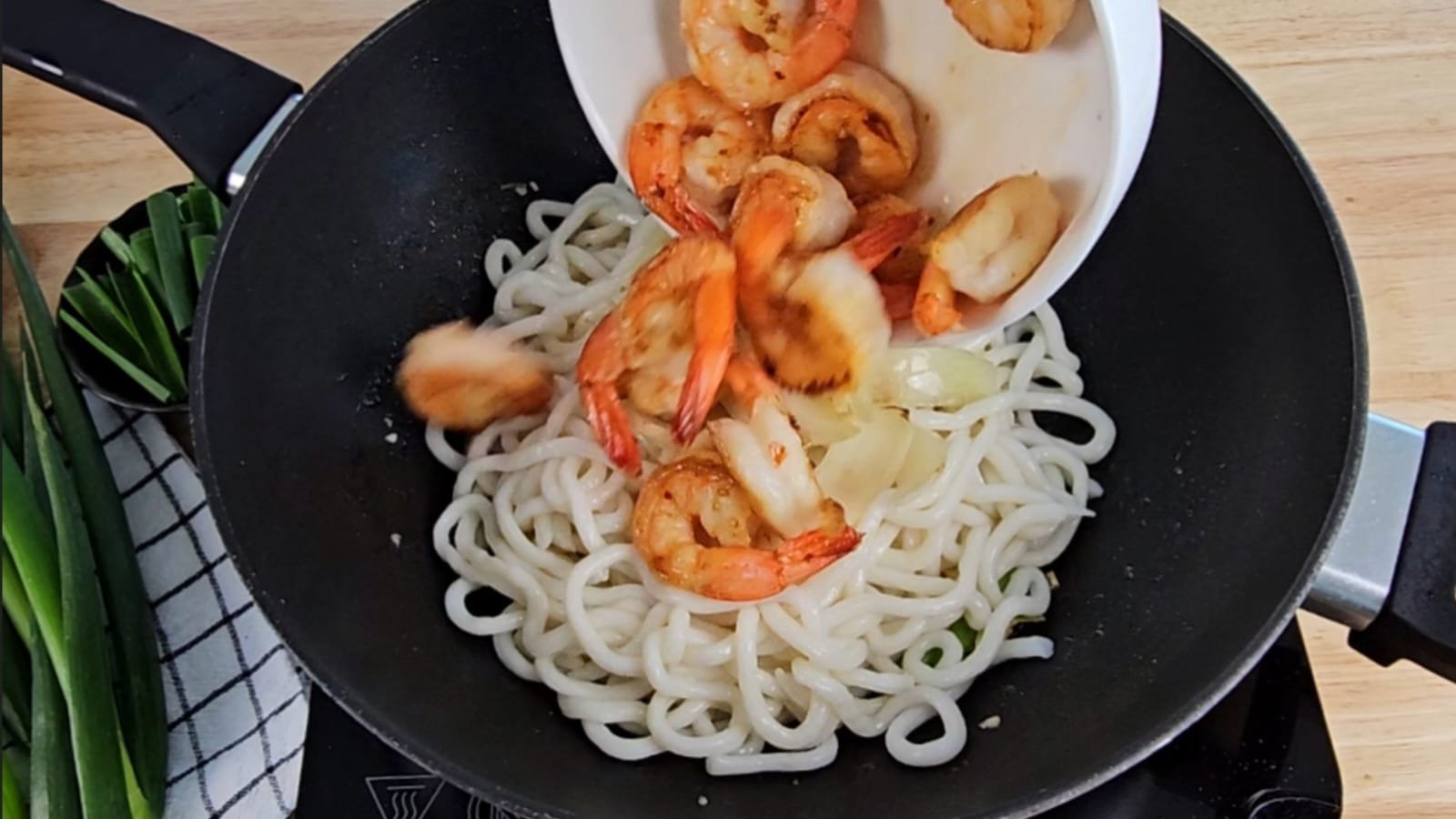 In the same wok, add the minced garlic and the white parts of the scallions. Sauté for 1–2 minutes, then add the udon noodles. Return the onions and prawns to the wok.
