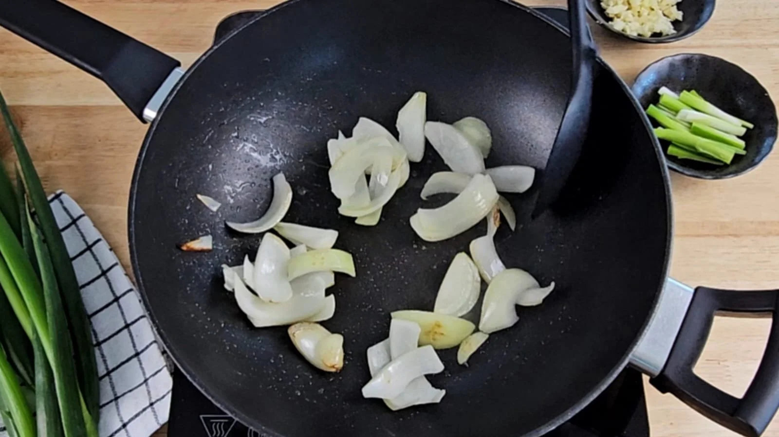 Heat 1 tsp of oil in a wok over high heat and sauté the onions for 1–2 minutes until slightly charred. Avoid overcooking so they stay crisp. Remove and set aside.