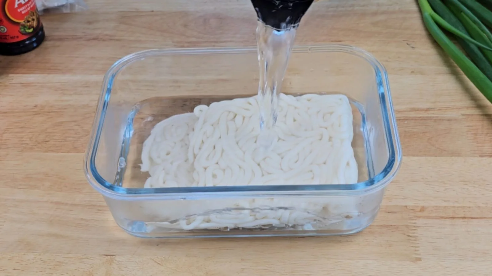 Soak the udon noodles in boiling water for 10–15 minutes, or until they loosen and soften. Preparation can vary by brand, so refer to the package instructions.