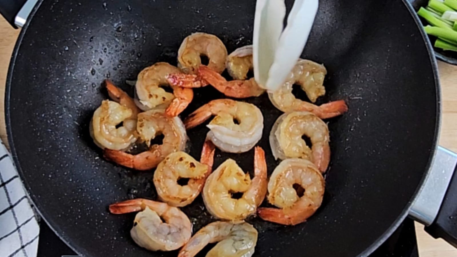 Add 2 tbsp of oil to the same wok and sauté the prawns for 4–5 minutes, adjusting the time based on their size. Remove once cooked.