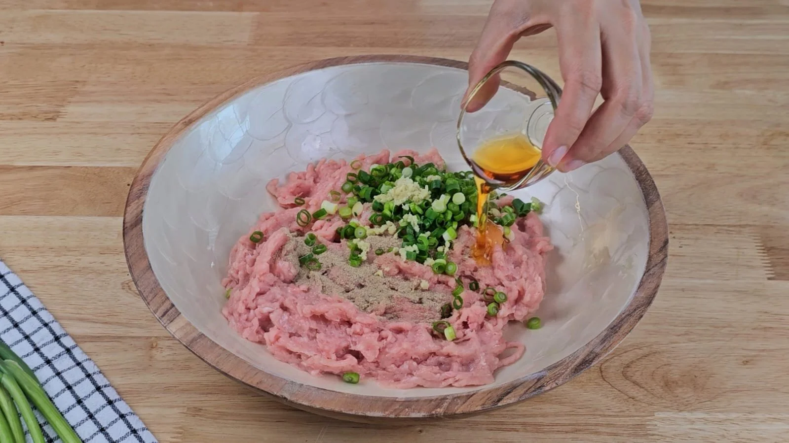 Add 1 tbsp of salt, 1/2 tbsp of white pepper, 20g of scallions, 1 tsp of grated ginger, and 1 tbsp of sesame oil and mix everything thoroughly.