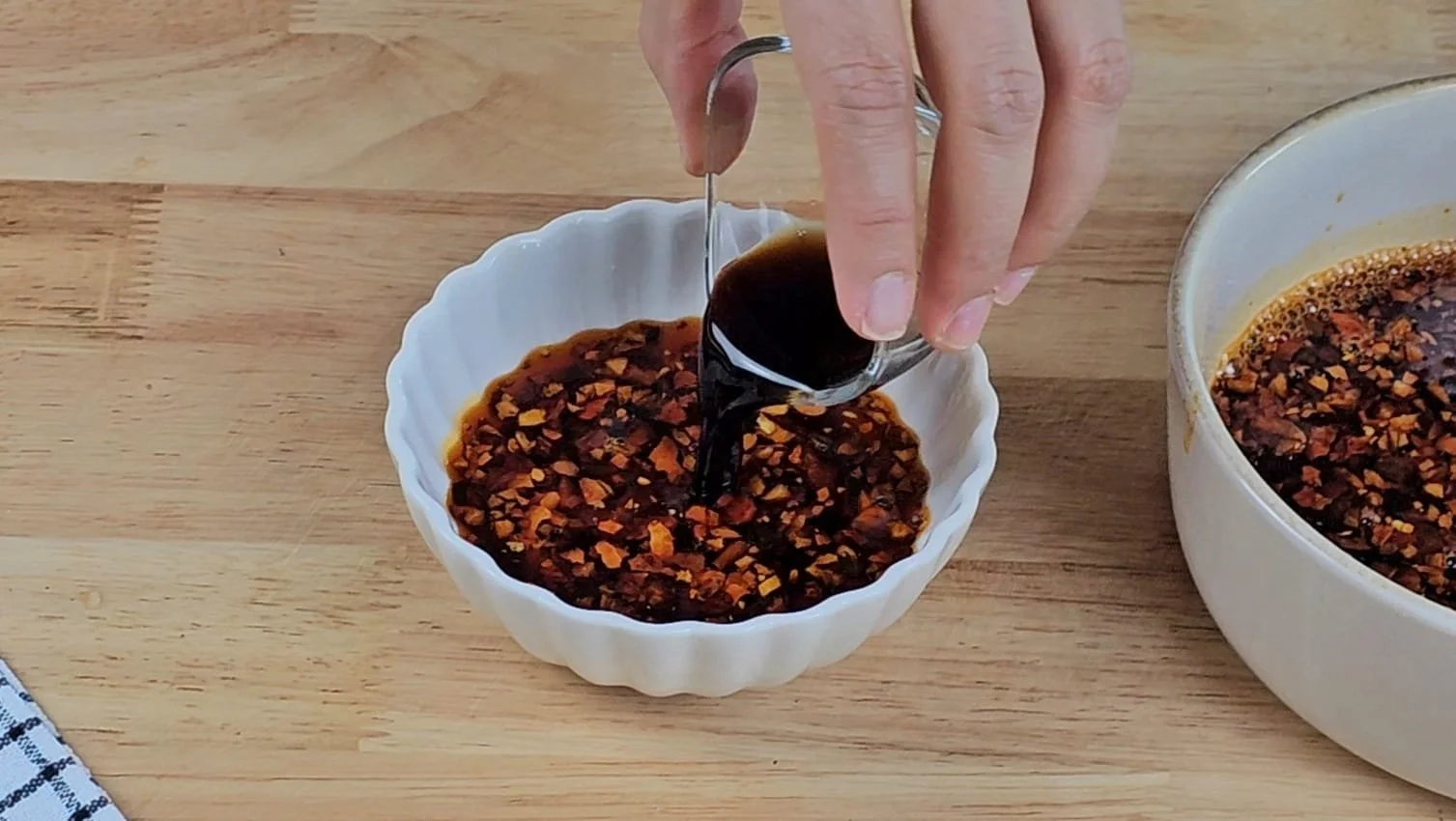 In a small bowl, add 4 tbsp of chili oil, 2 tbsp of light soy sauce, 1/2 tbsp of black vinegar and 1 tbsp of finely chopped scallions and mix well. This is the dipping sauce for the dumplings so you can adjust the taste to your liking.