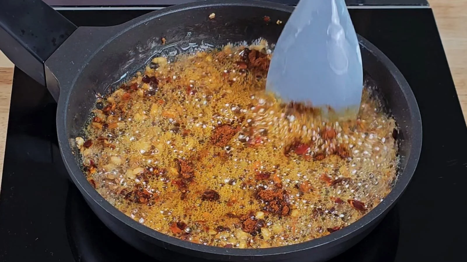 The homemade chili oil takes about 5 to 10 minutes to whip up, and you can store it in the fridge for later use on noodles, dumplings, or even stir-fries!