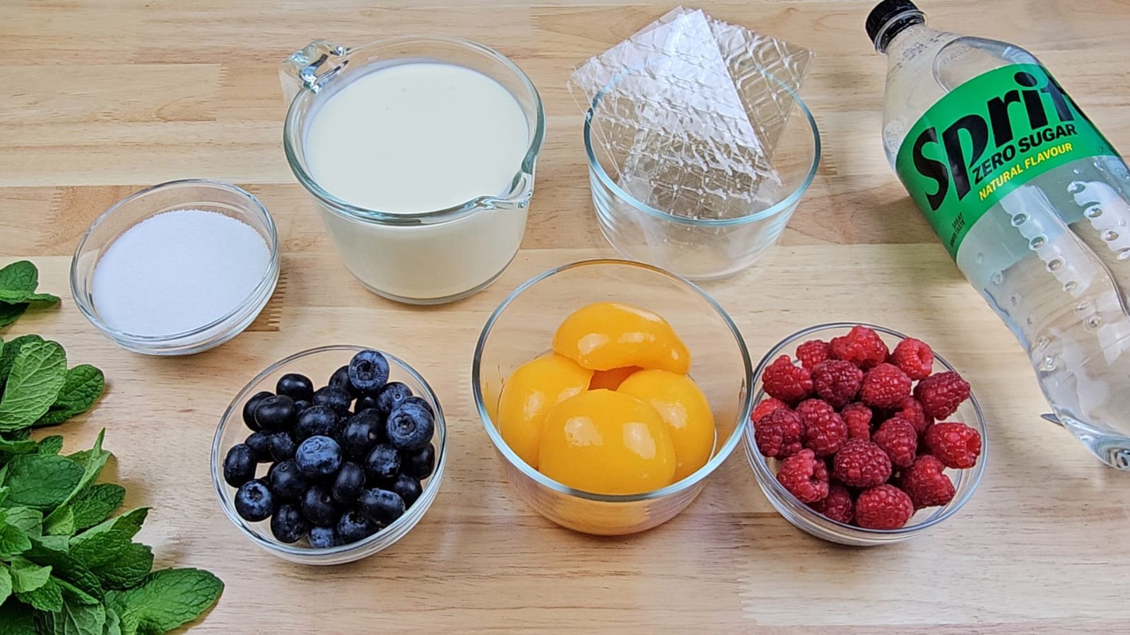 LAYER 3 - Place peaches, raspberries and blue berries on top of the jelly. Then pour 50ml of jelly mixture on top of the fruit and berries. Put it back into the freezer for another 15 minutes.