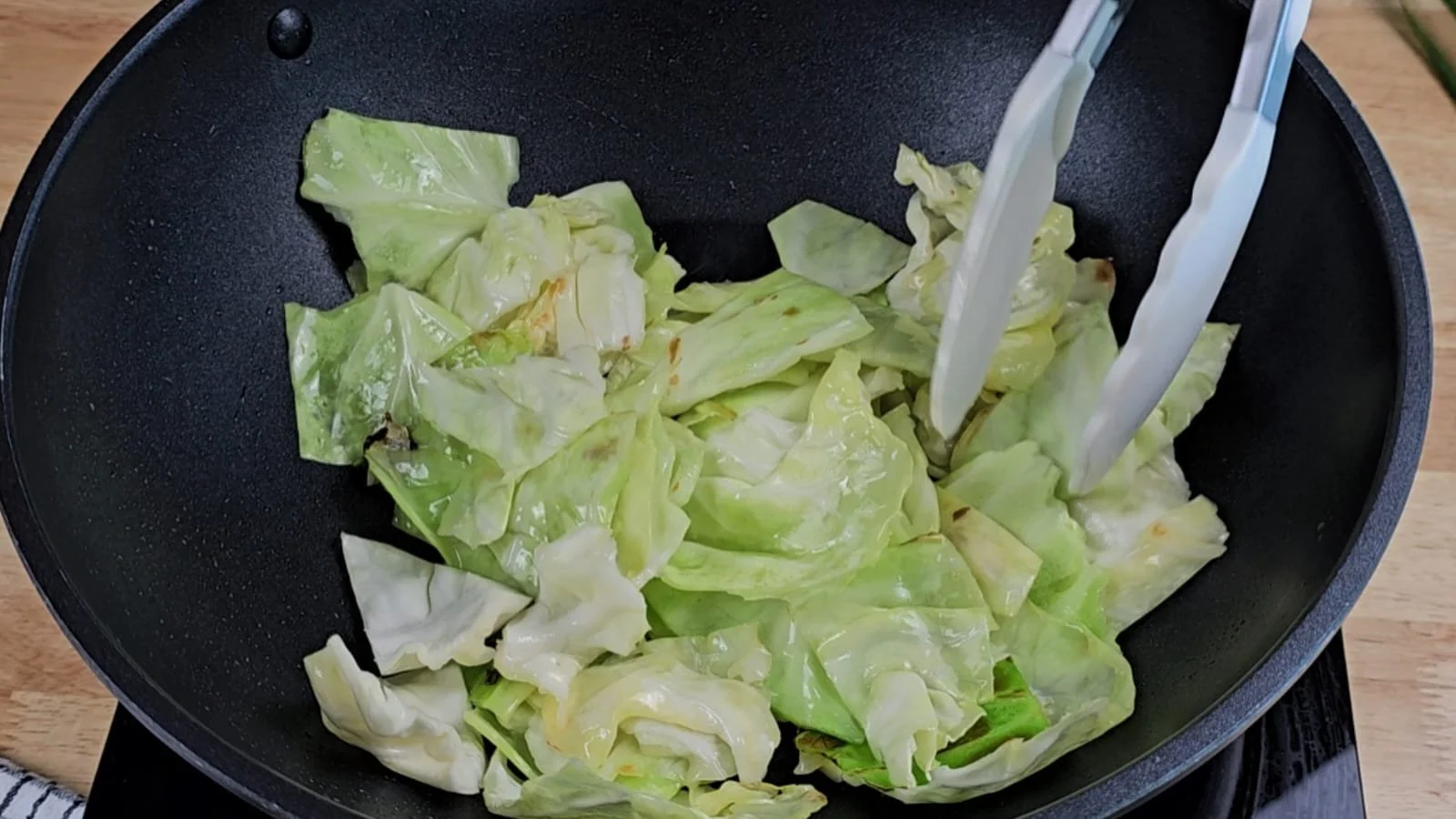 Stir-fry the cabbage over medium-high heat for about 2 minutes, until it softens slightly and gets a bit of char on the edges. Be careful not to overcook it—cabbage can turn soggy quickly. Remove it from the pan and set aside.