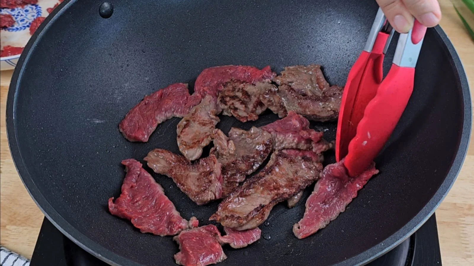 In the same pan, heat another 1 tablespoon of oil and sear the beef for about 1 minute per side. If your pan is small, do this in two batches to avoid overcrowding, which helps the beef get a nice sear and aroma. Remove the beef and set aside.