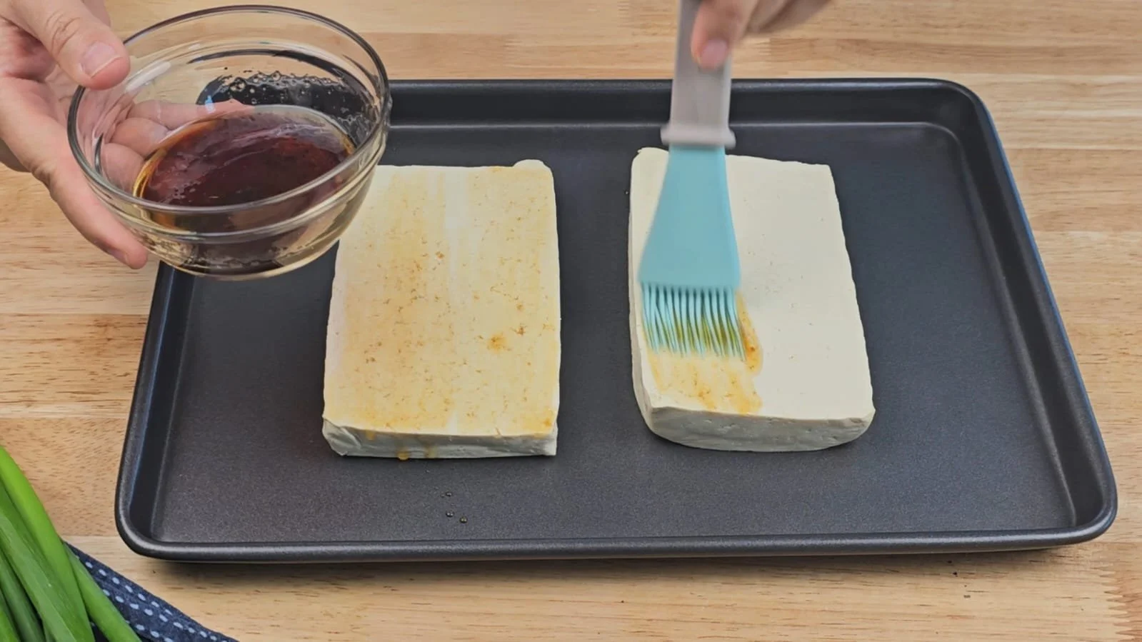 Marinate the tofu with soy sauce (1 tbsp), rice wine (or Chinese cooking wine - 1/2 tbsp) and sesame oil (1 tbsp). After marinating, lightly coat the tofu with 1/4 cup of cornstarch.